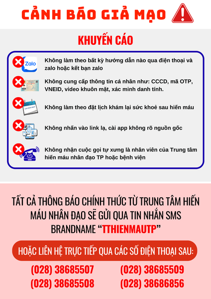 Hiện có đối tượng giả mạo Trung tâm hiến máu nhân đạo TPHCM gọi điện trực tiếp cho người hiến máu viện nhiều lý do bất thường và yêu cầu gửi ảnh CCCD/VNEID, kết bạn zalo để (hướng dẫn đăng ký khám/ làm xét nghiệm).